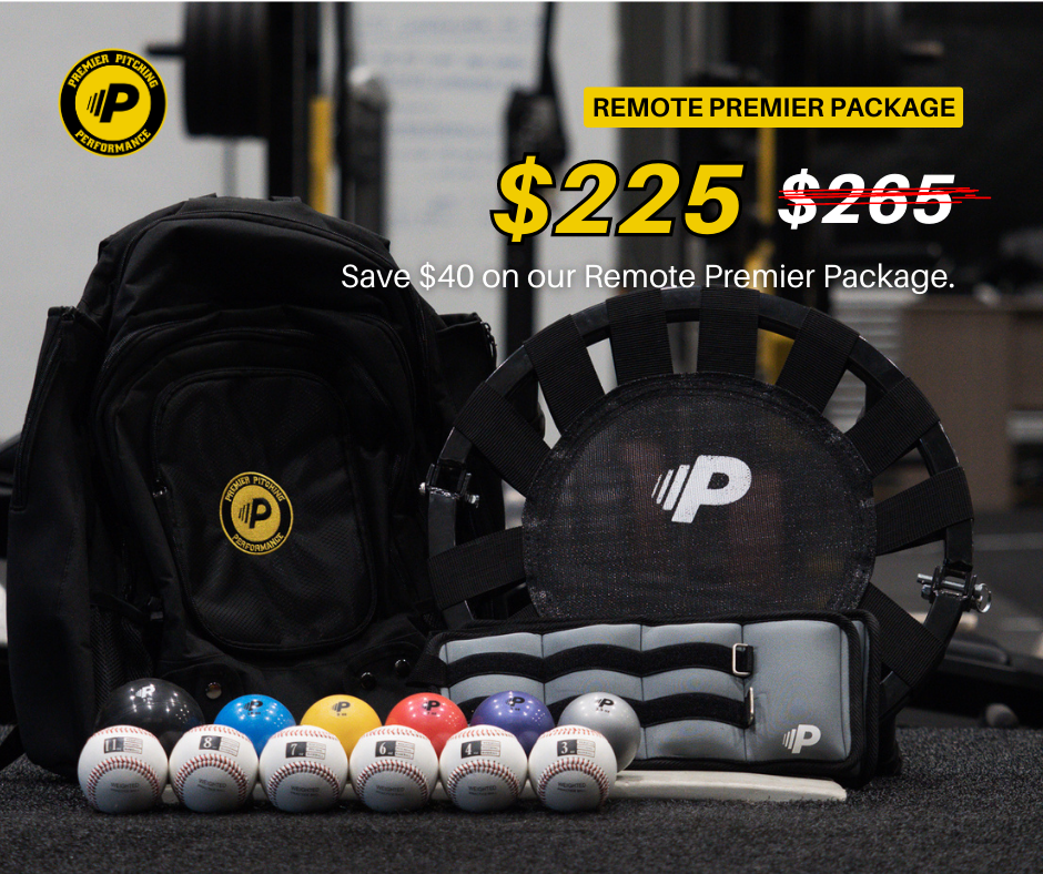 The Premier Remote Package consists of 1 wrist weight set, 1 set of plyo training balls, 1 set of leather weighted baseballs, 1 mini rebounder, and 1 backpack.