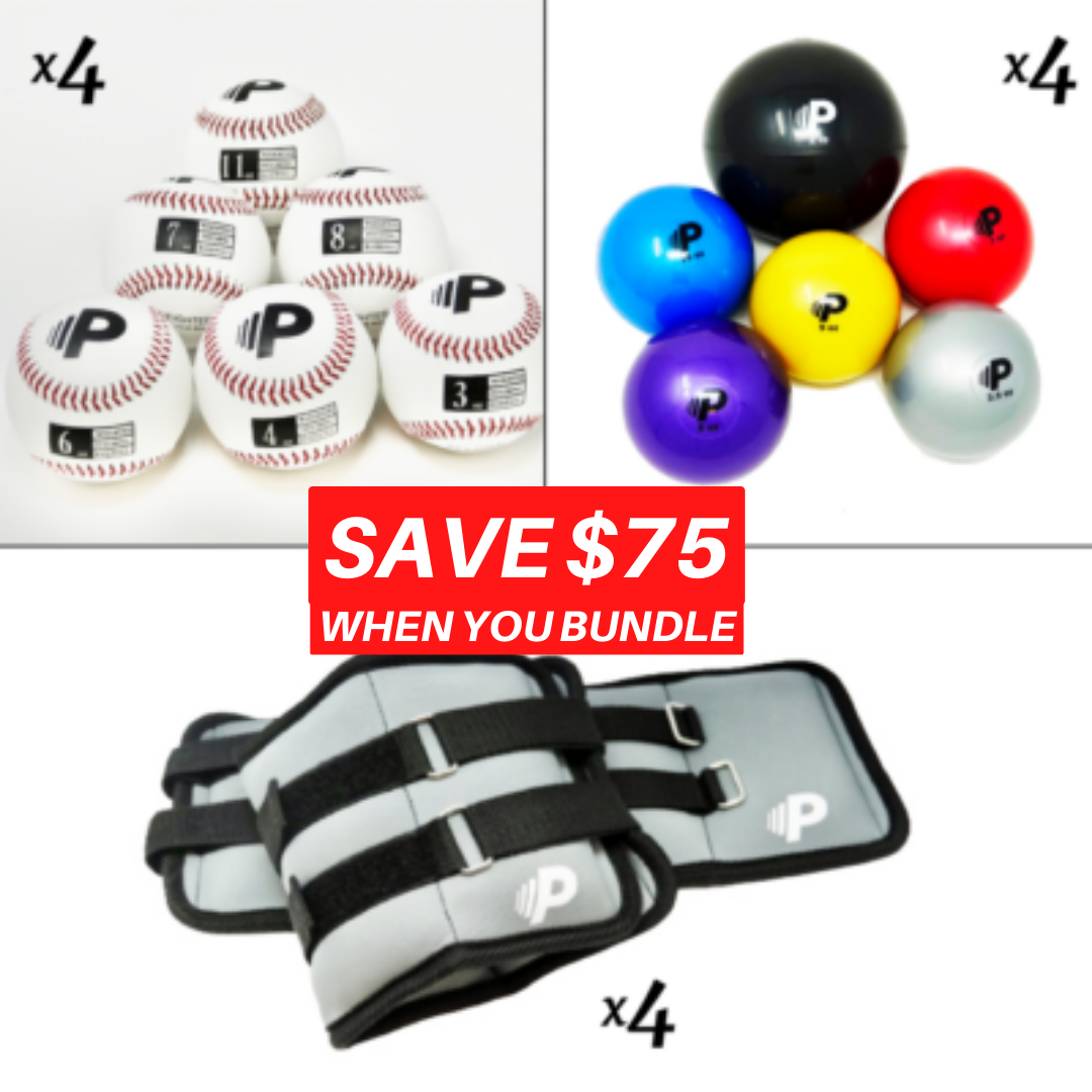 The Team Starter Package consists of 4 wrist weight sets, 4 plyo training ball sets, and 4 leather weighted baseball sets.